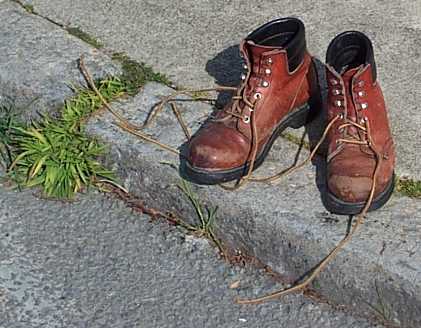 My feet! (He sits down again and tries to take off his boots.) Help me!