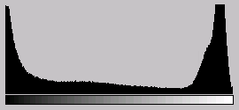 На гистограмме хорошо видны равномерные большие значения в области темных и 'почти белых' тонов.