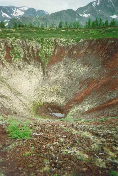 Кратер вулкана Перетолчина. Внизу- два человека.
