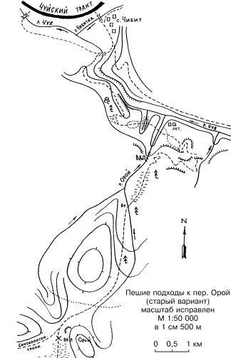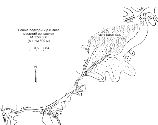 Подъезды к р. Шавла заканчиваются на пер. Орой. Этот маршрут уже отработан целым рядом местных водителей и транспортных фирм, поэтому в настоящее время можно считать его стандартным вариантом, а традиционный вариант пеших подходов от пос. Чибит оставить в прошлом. Следует только заметить, что, по крайней мере, в нашем случае водитель использовал дорогу, отличную от этого варианта: от Мажойского моста через р. Чуя вверх по борту долины р. Мажой (Маашей) и далее по верховому плато к пер. Орой. Лес кончается незадолго до перевала, однако с другой стороны начинается очень не скоро.