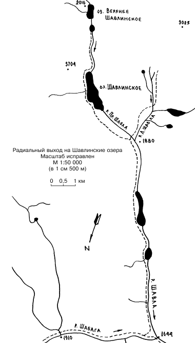 В районе стоянок тропа рассыпается на несколько рукавов, но вскоре снова собирается воедино, отходит от воды и немного поднимается на борт долины. Через 25 минут она круто спускается к стоянке, от которой отходят два пучка троп: налево на Шавлинские озера и направо на стрелку Шабаги и Верхней Шавлы. Стоянка столь же затоптана, как и остальные, хотя непонятно, где здесь вода. До стрелки отсюда 15 минут хода по плоской террасе.