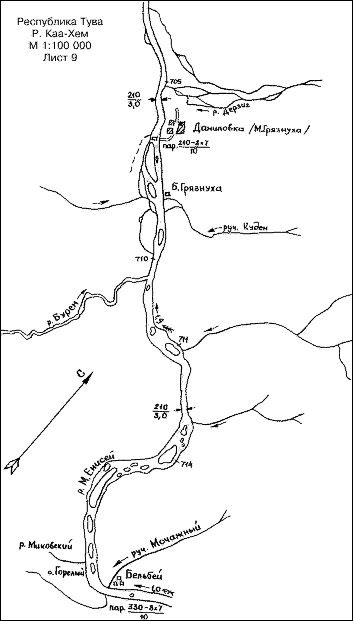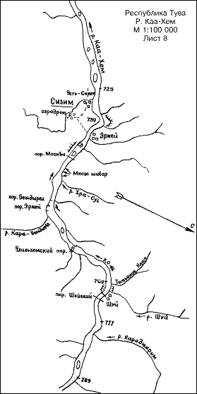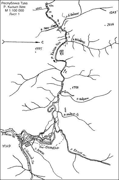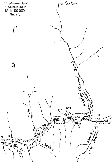 Сплав по р. Кызыл-Хем в избранном варианте маршрута начинается от пос.Уш-Бельдыр (Северный Аржаан), который связан с Кызылом авиационным сообщением. Аэропорт расположен на левом берегу р. Белин 1-2 км выше ее устья. Однако поскольку основная часть груза (включая лодки) была доставлена вертолетом и выгружена значительно ближе к поселку, сплав был начат в одной из проток в дельте р. Шишхид-Гол.