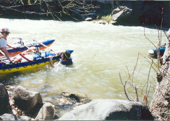 Начинаю дышать, как оказалось - вовремя. Все это время катамаран неподвижен. Как только я вынырнул - начинает двигаться. Такое впечатление, что река говорит: "Ну что, милок, вынырнул? Отдышался? Ну и ладушки, поехали дальше". Пытаюсь развернуться ногами вперед, держась за раму. Частично мне это удается. Замечаю впереди огромный валун, на который меня несет струей. Что делать? Да ничего не сделаешь. Нос катамарана ударяется об камень, пружинит, смягчает удар. Меня размазывает по камню как муху по стене. Немного давит, но в остальном жить можно. Вот только струей норовит сорвать кроссовки. Отдышавшись, принимаю решение плыть дальше, т.к. катамаран, прижимаемый струей, начинает выдавливать меня из гидры. Отклоняюсь чуть вправо, этого достаточно. Меня выносит из-за камня и несет по струе. Каким-то образом у меня в руках оказываются два весла: мое и запасное, которое было прикручено к раме резинками. Борюсь с катом и веслами, пытаясь при этом периодически посматривать на берег. Метрах в 20 у левого берега ждет четверка. Вижу, что спасконец никто мне не кидает и кричу им что-то типа "Эй, а спасать меня кто-нибудь будет?" Миша протягивает мне Т своего весла, за который и цепляюсь.
