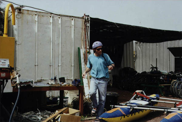 Встали около моста "Gesher Hapkak" (пробковый мост?), поддули катамараны, торжественно спустили их на воду (кормановскую двойку - впервые). Кто-то предложил разбить об борт двойки бутылку шампанского, но идея восторга не вызвала, т.к. шампанского не было, а если бы и было, ему нашли бы иное применение. Корман, кажется, робко заикнулся о замене шампанского минеральной водой, но и его не поддержали.