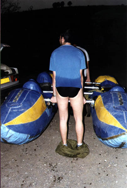 Миша Крейнин прочел первую коротенькую лекцию: катамаран в одиночку не поднимать, грести так-то, сидеть в упорах так-то. Мы слегка перекусили и стали натягивать гидры. О, эти гидры! Проще богачу попасть в рай, чем в меру упитанному человеку залезть в гидру размера XL. Но ничего, залезли, благо залезание облегчалось здоровенными дырками, разбросанными по гидрам в разных интересных местах. Мне досталась дырка над левым коленом и еще одна на том месте, где спина теряет свое гордое название.