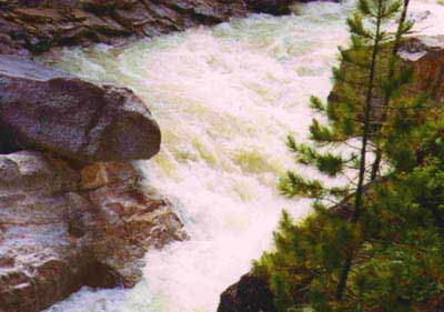 24 июля Дежурные Рома с Виталием. Всю ночь шел дождь, вода в реке прибыла на 30 см (а место не узкое). Цвет воды от зеленого перешел ближе к коричневому. Выходим часов около 11. Проходим оставшиеся пороги и шиверы до 19 порога. Перед ним встречаем группу из Кирова. Их стоянка расположена по левому берегу. Постепенно начинаем подходить к 19 порогу, перед ним чалимся, разведаем. Первую половину порога (до осыпи слева) решаем пройти как обычно, только пассажиры идут по берегу. Четверка проходит по основной струе ближе к правому берегу, я на двойке с Верой идем между камней недалеко от правого берега. Не доходя до осыпи метров 50 - чалимся. Стас с Ромкой идут на разведку, и мы остаемся ждать. Время близиться к обеду. Они проходили два часа, мы уже совсем собрались обедать. Спускаем катамараны дальше, за осыпь, на чалках. Затем проходим на четверке сильным экипажем еще метров 300. Двойку спускаем на чалке. Вода несет уже совсем бешенная, ближе к водопаду уклон увеличивается. С этого места (метров за 300 -400) начинаем обнос. Сначала несем рюкзаки. Вдоль по склону идет тропа. Мы пристали немного ниже маленького ручейка. Первые метров 200 тропа идет одна. Затем она разветвляется на две. Нижняя, по которой мы обносились, - нормальная тропа. По ней можно нести даже неразобраный катамаран четверку (правда тяжело). В одном месте там нужно штурмовать крутой каменный подъем, а, несколько дальше, есть достаточно крутой спуск. Длина тропы до того места, откуда мы собирались выходить, около 3 -3.5 км. Идти с грузом около 40 минут. Пройдя метров 100 по тропе, видна последняя горка перед водопадом. Слив с огромной бочкой смещен несколько вправо от центра реки. По моему мнению, в нашу воду этот слив категории 5..6, в нем могло бы спокойно кильнуть нашу четверку. Тропа обноса идет по заболоченной местности, и пригодных для стоянки мест долгое время нет. Тропа идет высоко, но можно спокойно приблизиться к краю обрыва и рассмотреть пороги в ущелье. Первый порог - водопад,