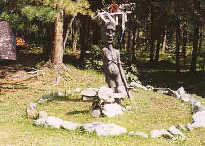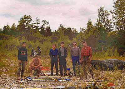 9 августа. Дошли до поселка Октябрьский. Основная задача - не пройти мимо. Несколько километров не доходя до него - дома одного из поселков. Там мы узнали, что автобус из Октябрьского ходит по понедельникам, четвергам и пятницам. Сегодня - воскресенье и автобус уйдет завтра в 6 утра. Дойдя до Октябрьского, мы остановились на галечной косе потом оказавшейся островом. Можно пройти еще 100 метров и остановиться на нормальном берегу. Сам поселок расположен по левому берегу. От реки до остановки метров 300. Погода стояла нормальная, и мы все высушили. Вечером приготовили праздничный ужин, торт, компот из облепихи (ее очень много растет на берегу). Кутузов сделал чучело "Великого Водника", которое торжественно сожгли. Легли спать и, около 11, часов началась гроза. Многим казалось, что нас сейчас смоет поднявшаяся река.