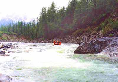 22 июля. Дежурят Стас с Ольгой. Выходим с утра между 10 и 11 часами. Продолжаем таскаться. Начинаются шиверы и порожки. По малой воде они несложные. Обед делаем на базе геологов: избушка на большом открытом месте по левому берегу. До этого места Стас в свой прошлый поход дошел за день от моста по большой воде. Избушка в хорошем состоянии, внутри целая печка, нары. Впечатление, что люди были здесь совсем недавно и скоро вернутся - на столе недопитая водка. Но место вокруг плохое, много мусора и следов деятельности человека. После обеда продолжаем сплавляться. Шиверы становятся сложнее, некоторые из них, вероятно, считаются порогами. Перед порогом 5 четверка вылетает на камень и надолго застревает, мы проскакиваем метров 50 дальше, чалимся, ждем, когда они пройдут вперед, затем идем дальше. Неожиданно разглядываем, что идем в серьезный порог, выгребаемся и удачно проходим слив, и пристаем к правому берегу. Порог 5 представляет собой разгонную шиверу, затем следует непрямой слив высотой около полуметра. Проходить слив следует ближе к левому краю, так как справа идет ряд больших обливных камней. Вода, переливаясь через них, образует большую бочку справа от основного прохода. Категорийность - 4. Разведку и страховку лучше делать по правому берегу, там берег после порога низкий (слева скала).