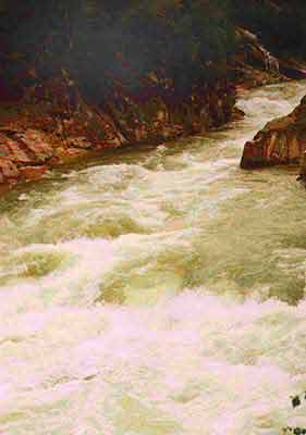 который еще иногда называют турбиной. Река шириной метров 40 сваливается в щель шириной 3 - 4 метра. Эта щель непрямая, а изогнутая наподобие лопасти винта. Вода падает с высоты метров 3 и на всем протяжении с силой бьет в скалу. Следующее препятствие - через метров 50 несколько разбросанных в русле обливных камней и затем струя бьет левобережную скалу, в которой промыт большой подводный карман. Эти оба препятствия - непроходимы. Далее в каньоне идет ряд порогов попроще. Один из следующих мы хорошо рассмотрели со скалы сверху. Называется он -- "Винт". Посередине каньона стоит огромный камень. Струя обходит его справа. Поток идет на спад по большой дуге, так, что вливается в дальнейший поток под углом 90 градусов с правой стороны. На слиянии струй - косая бочка. Порог, проходимый при нормальной страховке (в каньоне это несколько затруднено) и сильном экипаже.