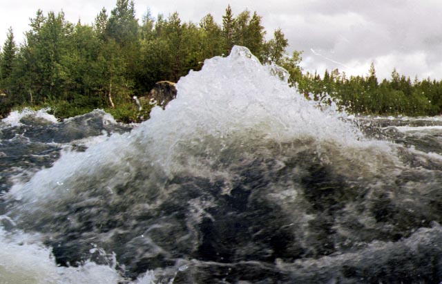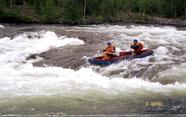 После двух простеньких перекатов приняли слева Родвиньгу (или она приняла нас). В месте слияния стояли на якоре три безлюдных катера с мощными иностранными моторами. Димка прошел Родвиньгу в 1995 г. Там надо идти только схоженным опытным экипажем на маневренном мелкосидящем судне. Только полное соблюдение этих условий обеспечило тогда успех. Кроме того, на Родвиньгу возят иностранцев ловить семгу, поэтому рыболовные лицензии на эту реку не распространяются. Правда, Димку в 1995 г. никто не тормозил, да и попробуй тормозни на такой струе!