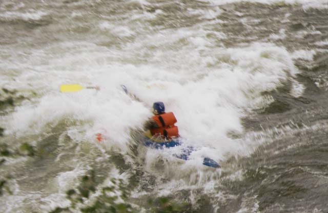 Итак, мимо Киры, который уже занял свое место в перевязанных упорах, и Димки Куликова, который начал перетаскивать "Матрас" к верхнему краю улова, проплывает девушка и просит помощи. Решение принимается совместно и незамедлительно. Под вопль Киры: "Садись быстро!" Димка прыгает в лодку, и они бешено начинают выгребать на струю. Теперь уже Димка не успевает встать в упоры, а место старта, выбранное впопыхах, не позволяет им поставить судно вдоль струи, и в Б1 третьей ступени их кладет. Внимание многочисленных зрителей теперь обращено уже на два терпящих бедствие судна. Между тем девушка вместе с каяком входит в котел Б2 и повторяет печальный опыт Димки образца 1995 г. - в весьма жесткой Б2 судно и экипаж почти неизбежно теряют друг друга. Теперь даже с берега видно, что положение девушки более чем критическое - она потеряла предпоследнюю опору (весло все еще при ней) и с трудом удерживает голову над водой. Спасает то, что она уже вышла в шиверную четвертую ступень.