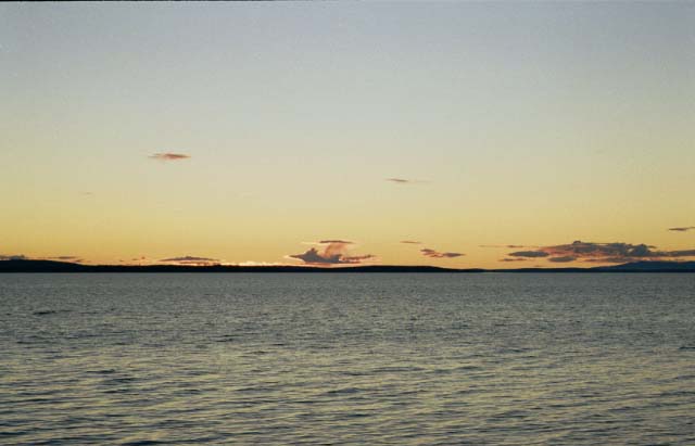 Мудрость дня:По мере продвижения на юг ветер крепчал. Сначала пришлось натянуть фартук, а потом и юбки. Нас даже слегка побрызгало дождичком - просто чтобы мы не забыли, что это такое. Димка с Мишкой, похоже, притомились и часа через полтора пристали к левому берегу. Для стоянки он малопригоден. Поверхность представляет собой камни, прикрытые толстым слоем мха. Дно у берега в некоторых местах песчаное даже с намеками на пляж, но палатку все равно поставить негде. Несмотря на стандартное время для остановки на ночлег, решили идти до победного, тем более что ветер стихал. Через два часа бдительный Вася узрел достаточно внушительный пляж с хорошим местом для ночевки. Ориентиром является остров номер четыре, совсем крохотный и с воды почти невидимый. Так что, попав в аналогичную ситуацию, идите поближе к левому берегу. К моменту выгрузки озеро было плоским, как зеркало, в котором отражался изумительной красоты закат.
